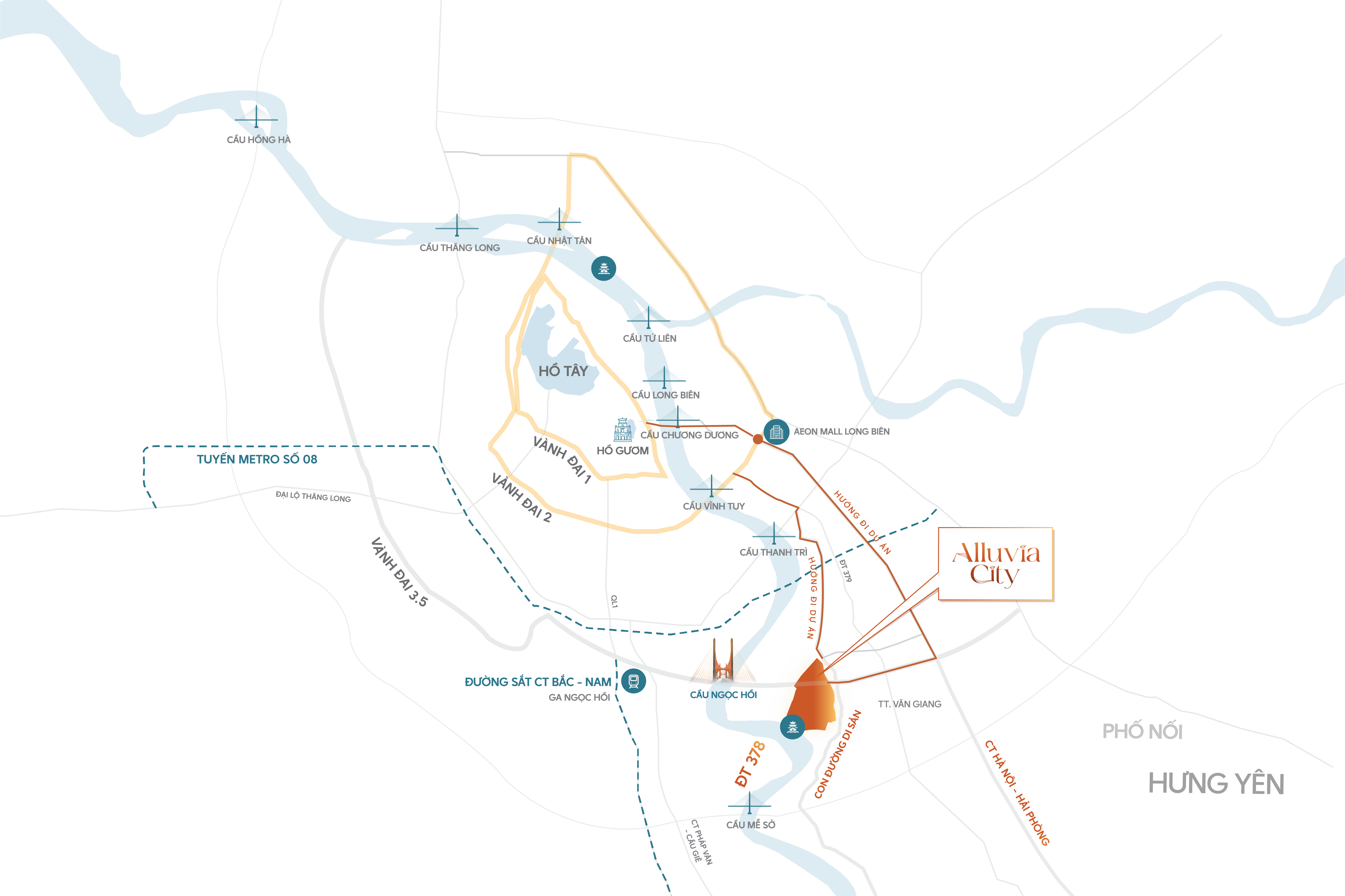 Alluvia City nắm giữ toạ độ đắc địa trong bán kính gần Hồ Gươm hơn 85% các địa điểm còn lại của Hà Nội. Một thành phố toạ lạc tại vị trí trung tâm quy hoạch ven sông Hồng, nơi “địa linh nhân kiệt”, vùng đất của các đại đô thị sinh thái & phát triển, sở hữu tầm nhìn kết nối dài hạn và giá trị đầu tư không ngừng gia tăng nhờ lợi thế.